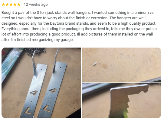 “Bought a pair of the 3-ton jack stands wall hangers. I wanted something in aluminum vs steel so I wouldn't have to worry about the finish or corrosion. The hangers are well designed, especially for the Daytona brand stands, and seem to be a high quality product. Everything about them, including the packaging they arrived in, tells me they owner puts a lot of effort into producing a good product. Ill add pictures of them installed on the wall after I'm finished reorganizing my garage..”