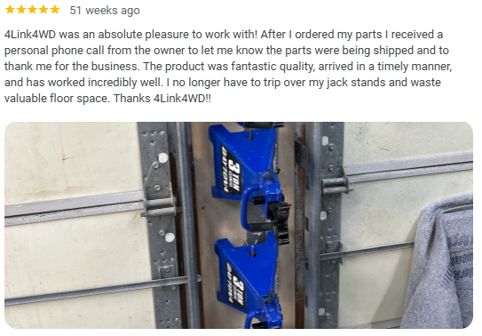 “4Link4WD was an absolute pleasure to work with! After I ordered my parts I received a personal phone call from the owner to let me know the parts were being shipped and to thank me for the business. The product was fantastic quality, arrived in a timely manner, and has worked incredibly well. I no longer have to trip over my jack stands and waste valuable floor space. Thanks 4Link4WD!!”