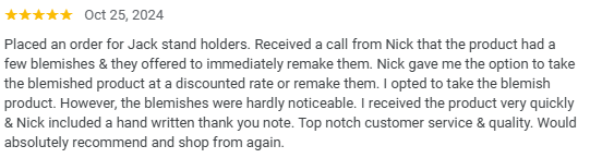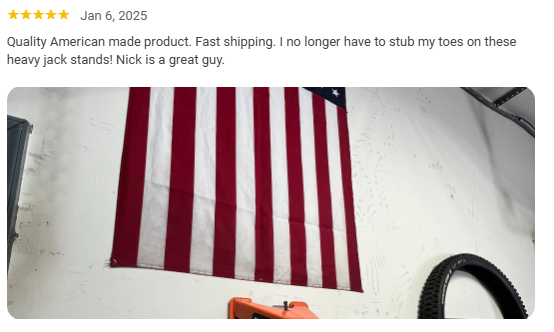 “Quality American made product. Fast shipping. I no longer have to stub my toes on these heavy jack stands! Nick is a great guy.”